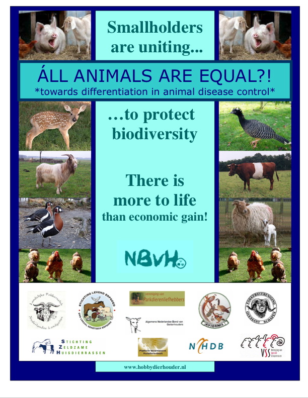 Ved de store udbrud af Svinefeber, Mund- og Klovsyge, og Fugleinfluenza i Holland var hobbyavlere fejlagtigt behandlet på samme måde som store kommercielle dyrehold. Dette resulterede i at hundredtusindvis af raske dyr blev dræbt/destrueret og det gik ud over titusindvis af hobbyavlere.